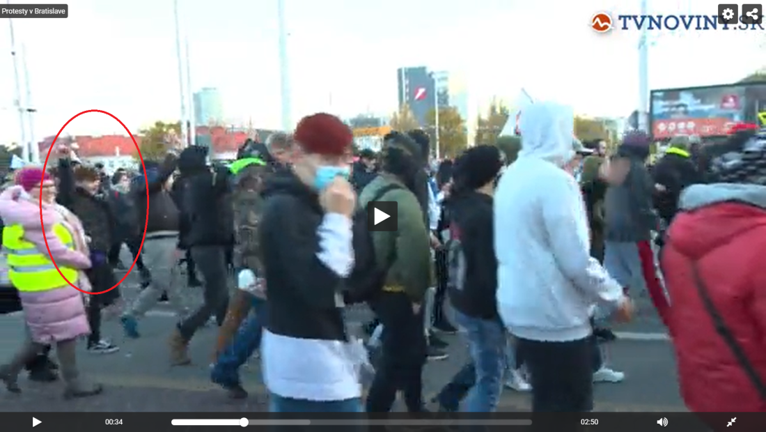 Video televízie Markíza (v poradí druhé video v článku) ukazuje mladíka pred Hlavnou stanicou v čase 0:34. Na zábere vidno, že skanduje spolu s davom a má zdvihnutú ruku.