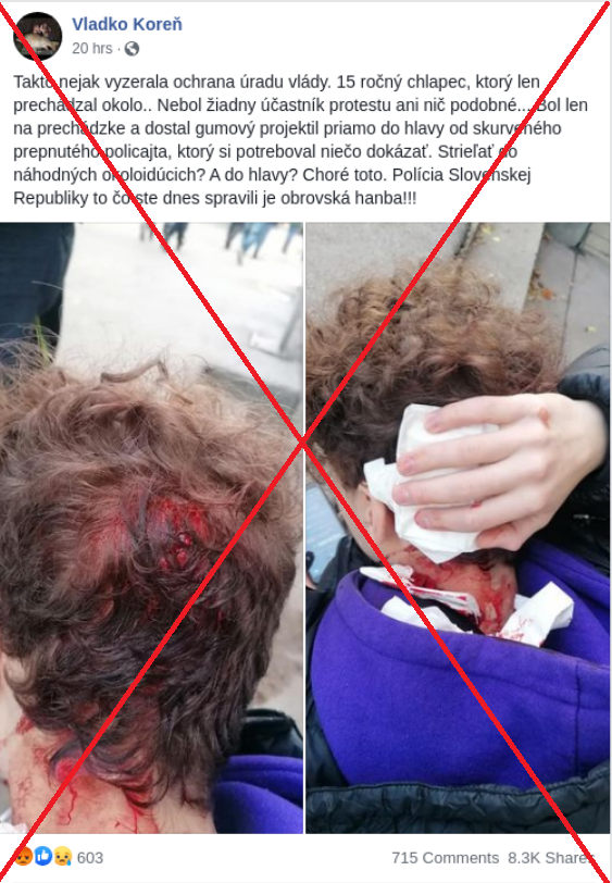 Na Facebooku sa 17. novembra 2020 rozšíril tento príspevok. V texte v obrázku sa tvrdí: „Takto nejak vyzerala ochrana úradu vlády. 15 ročný chlapec, ktorý len prechádzal okolo.. Nebol žiadny účastník protestu ani nič podobné... Bol len na prechádzke a dostal gumový projektil priamo do hlavy od sk**veného prepnutého policajta, ktorý si potreboval niečo dokázať. Strieľať do náhodných okoloidúcich? A do hlavy? Choré toto. Polícia Slovenskej Republiky to čo ste dnes spravili je obrovská hanba!!!”