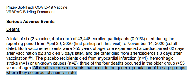 Všetky úmrtia predstavujú udalosti, ktoré sa v bežnej populácii vyskytujú v daných vekových skupinách, v ktorých ku nim došlo, v podobnej miere,“ píše sa v dokumente FDA.