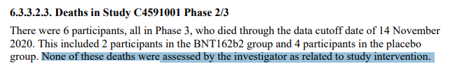 V dokumente sa píše, že počas sledovaného obdobia zomrelo 6 účastníkov klinickej skúšky, dvaja z očkovanej skupiny, štyria po podaní placeba.