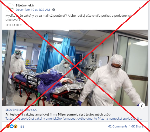 9. decembra 2020 bol na portáli hlavnespravy.sk zverejnený článok s titulkom „Pri testovaní vakcíny americkej firmy Pfizer zomrelo v USA šesť testovaných osôb“.