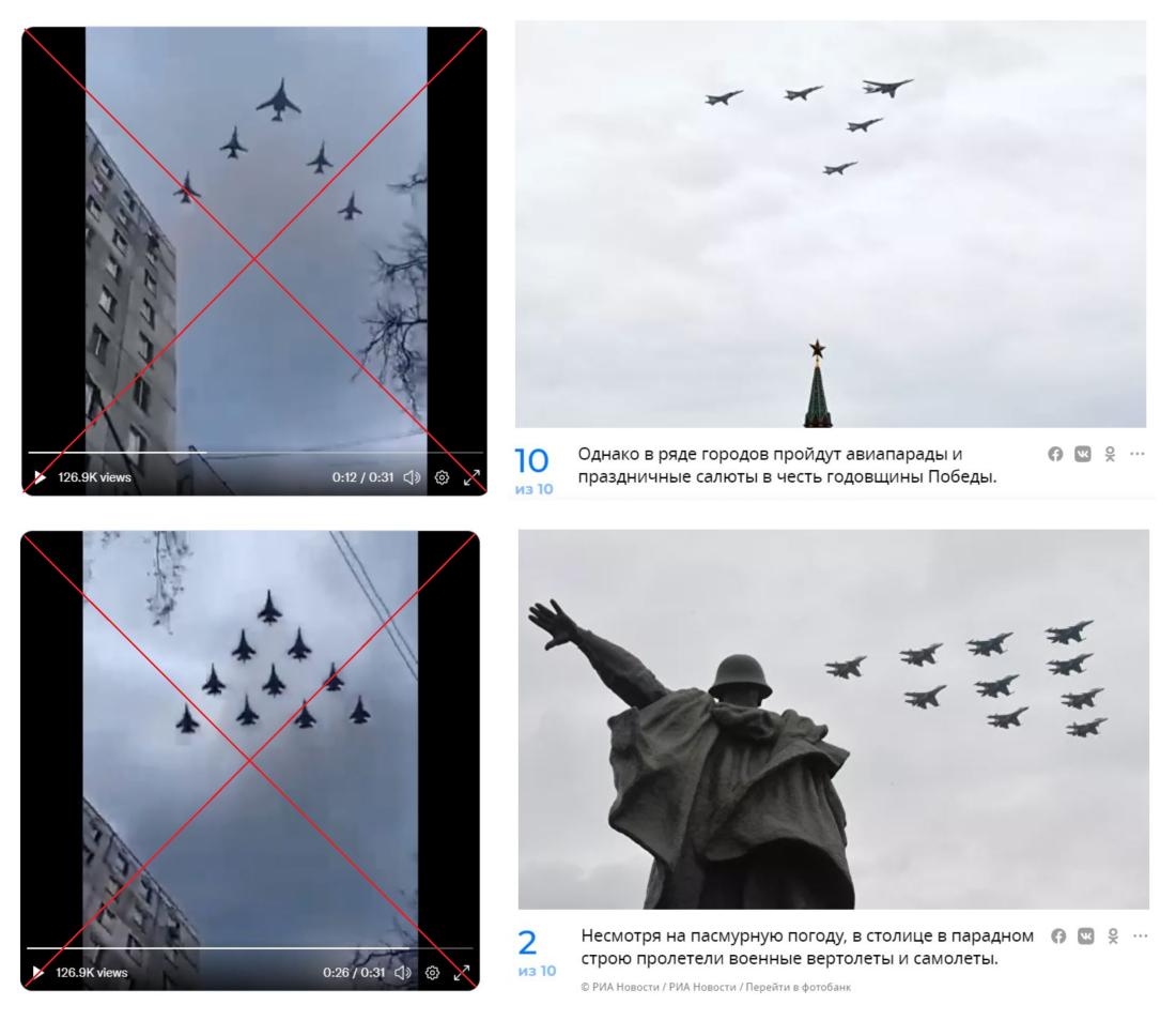Nižšie je porovnanie záberov z videa v zavádzajúcom príspevku (vľavo) a fotografií z RIA Novosti (vpravo):