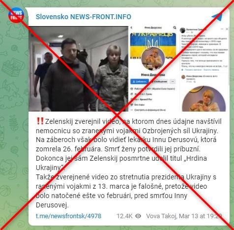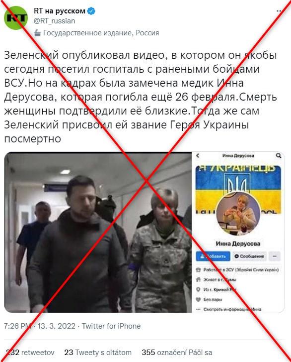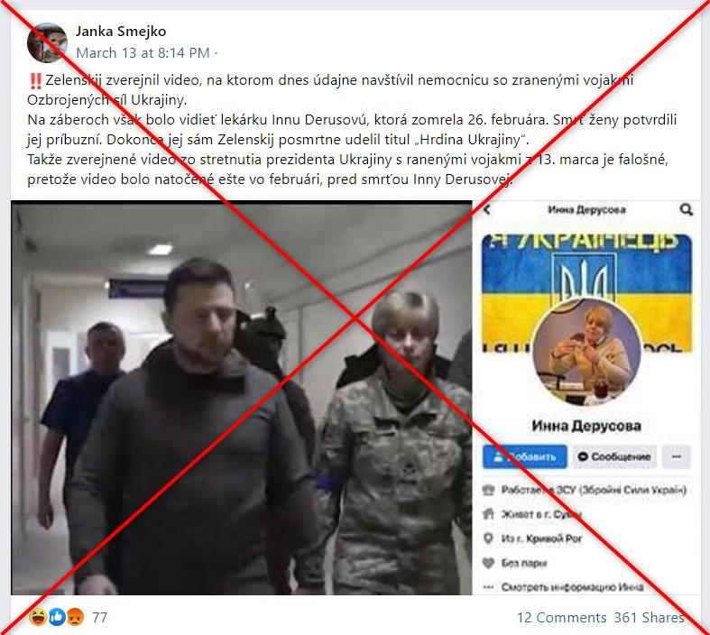 Viac ako 350 používateľov zdieľalo facebookový príspevok slovenského súkromného profilu z 13. marca v znení: „Zelenskij zverejnil video, na ktorom dnes údajne navštívil nemocnicu so zranenými vojakmi Ozbrojených síl Ukrajiny. Na záberoch však bolo vidieť lekárku Innu Derusovú, ktorá zomrela 26. februára. Smrť ženy potvrdili jej príbuzní. Dokonca jej sám Zelenskij posmrtne udelil titul ‘Hrdina Ukrajiny’. Takže zverejnené video zo stretnutia prezidenta Ukrajiny s ranenými vojakmi z 13. marca je falošné, pretože video bolo natočené ešte vo februári, pred smrťou Inny Derusovej.“