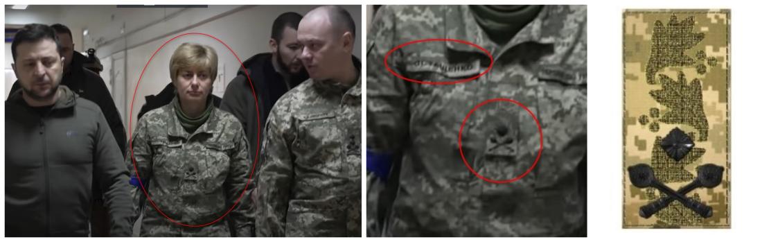 Pri bližšom pohľade na video (v čase okolo 0:16) však môžeme vidieť aj detail uniformy ženy kráčajúcej po Zelenského ľavici. Na uniforme vidíme v azbuke napísané meno Ostaščenko (po ukrajinsky Остащенко, pozn. red.) a taktiež insignie pre hodnosť brigádneho generála ukrajinských ozbrojených síl.