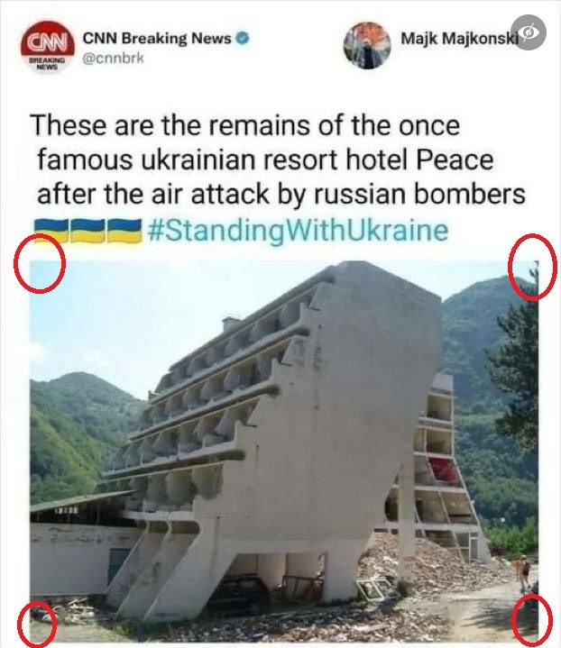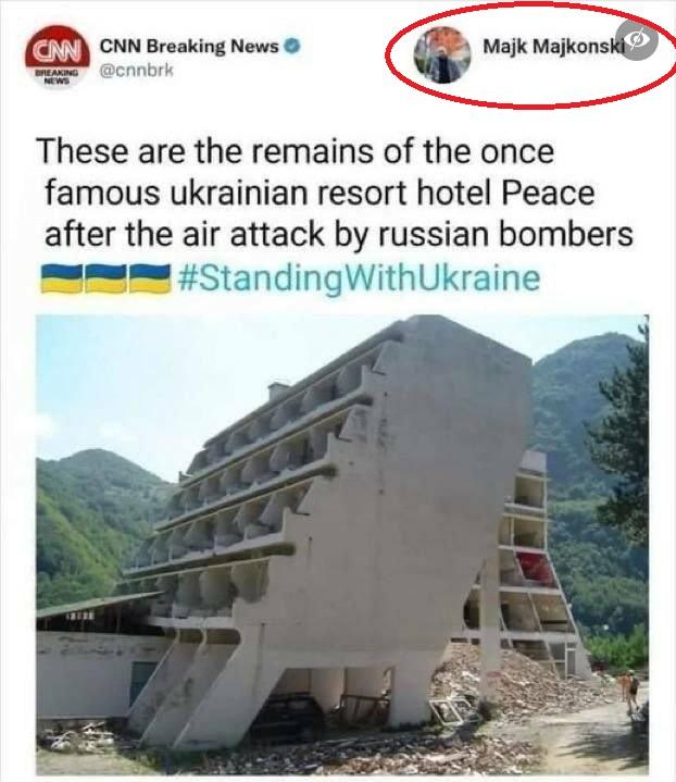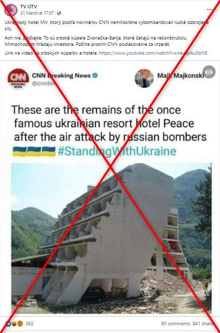 Facebookový príspevok z 21. marca 2022 obsahuje údajnú snímku príspevku z twitterového "CNN Breaking News", v ktorom sa v angličtine píše: "Toto sú pozostatky kedysi slávneho ukrajinského hotela Mir po leteckom útoku ruských bombardérov #StandingWithUkraine".