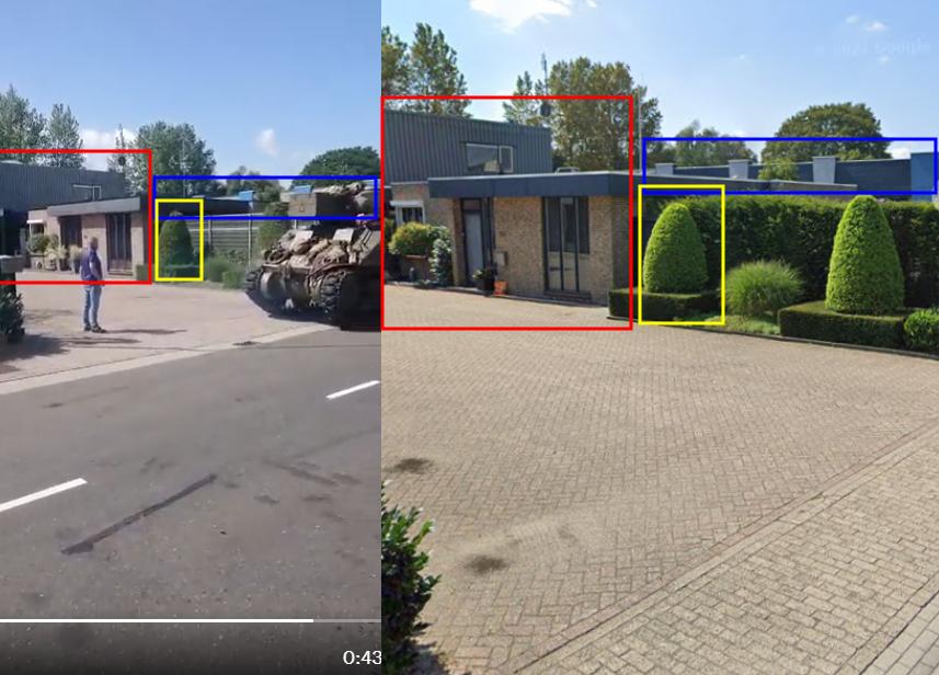Ak sa v Google Street View presunieme po ulici len o niekoľko metrov ďalej, môžeme si všimnúť aj miesto, na ktorom bolo natočené video s tankom vykladaným z prívesu. Môžeme vidieť rovnaké budovy (červenou a modrou) či rovnaký živý plot (žltou):
