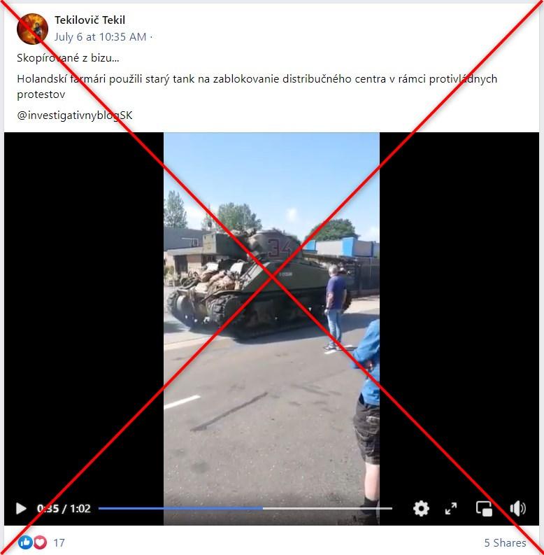 Video zverejnené slovenským používateľom Facebooku 6. júla zachytáva, ako sa z nákladného auta vykladá armádny tank. V popise videa sa nepravdivo uvádza, že „holandskí farmári použili starý tank na zablokovanie distribučného centra v rámci protivládnych protestov“.