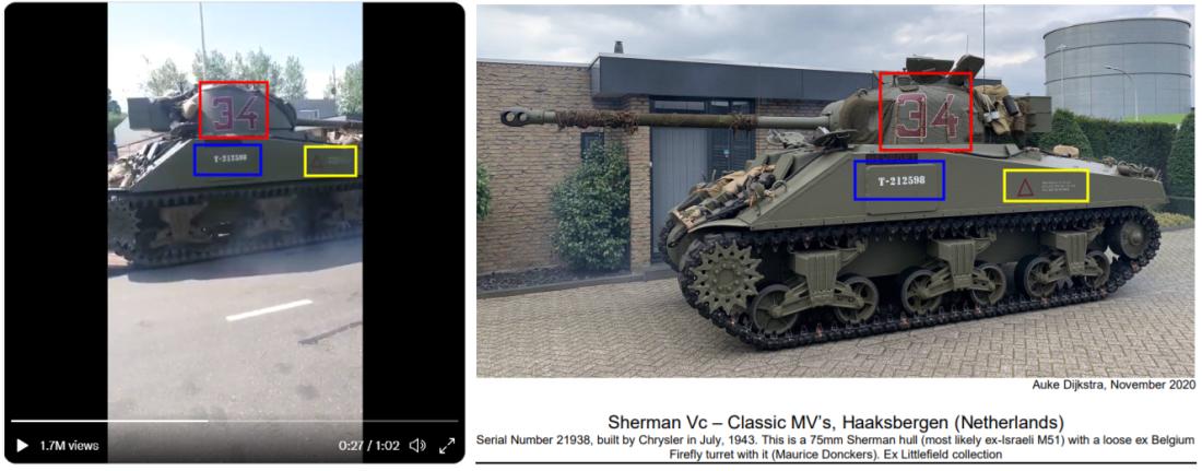 Na tejto stránke je fotograf identifikovaný ako „Auke Dijkstra“ a majiteľ vozidla ako Classic MV's v holandskom meste Haaksbergen. Pri porovnaní snímky z videa (vľavo) a archívnej fotografie (vpravo) vidíme, že sa viacero detailov zhoduje, a je zrejmé, že ide o rovnaké vozidlo: červenou sme označili číslo 34, modrou sériové číslo T-212598 a žltou je označený červený trojuholník s bielym nápisom.