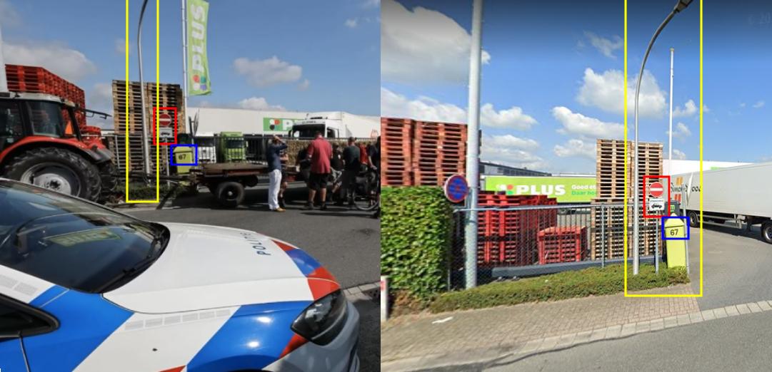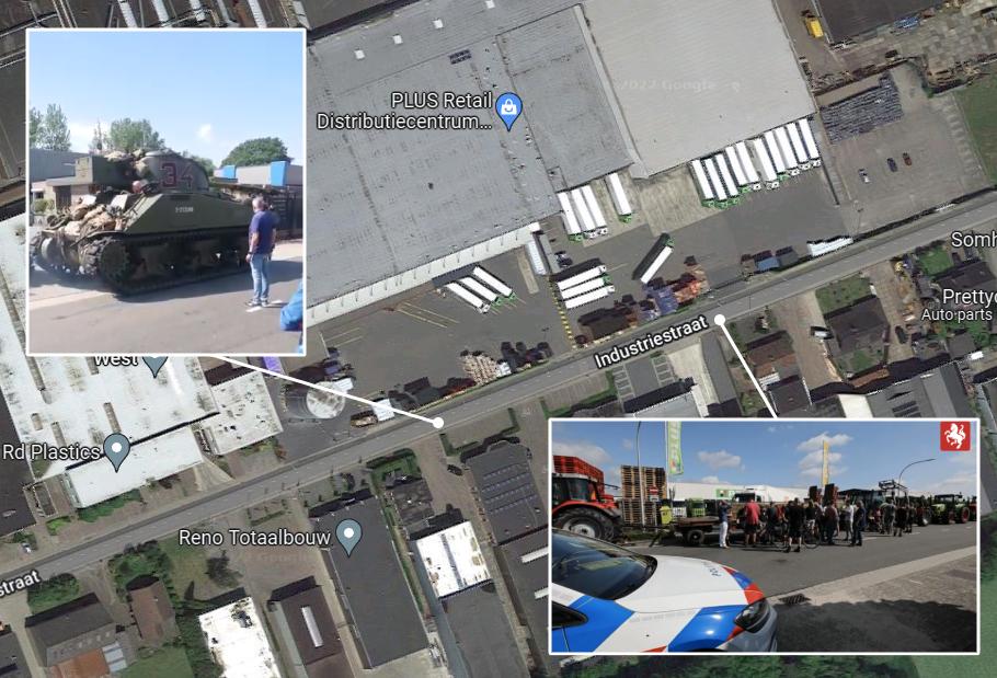Porovnaním prvkov vo videu z novín Tubantia agentúra AFP potvrdila miesto konania protestu pri distribučnom centre PLUS pomocou služby Google Street View. Jedná sa o ulicu Industriestraat v Haaksbergene. V oboch snímkach sa zhodujú detaily ako stĺp (označený žltou), dopravné značky (červenou) a zelený stĺp s číslom domu 67 (modrou):