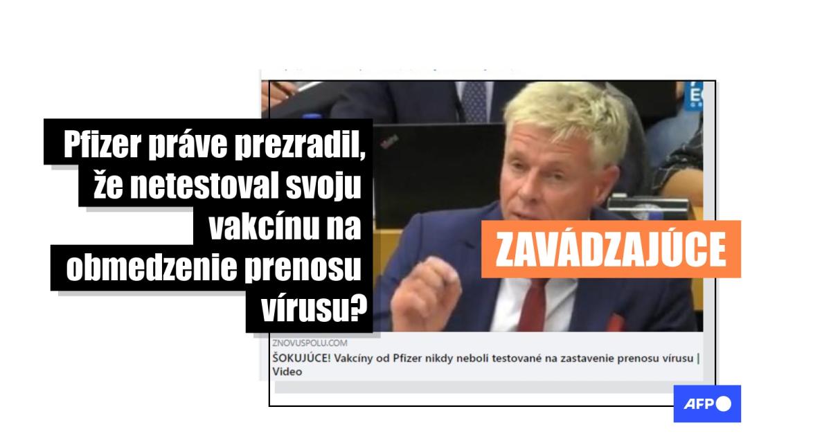 „Na vypočúvani ohľadom Covidu na pôde Európskeho parlamentu, zástupkyňa firmy Pfizer – Janine Small (prezidentka pre teritórium rozvinutých krajín) priznala, že Covid vakcína nikdy nebola testovaná na zabránenie prenosu vírusu predým, ako bola uvedená na trh,“ píše sa v článku stránky znovuspolu.com, ktorý taktiež obsahuje predmetné video a ktorý zdieľalo na Facebooku viac ako 300 používateľov.