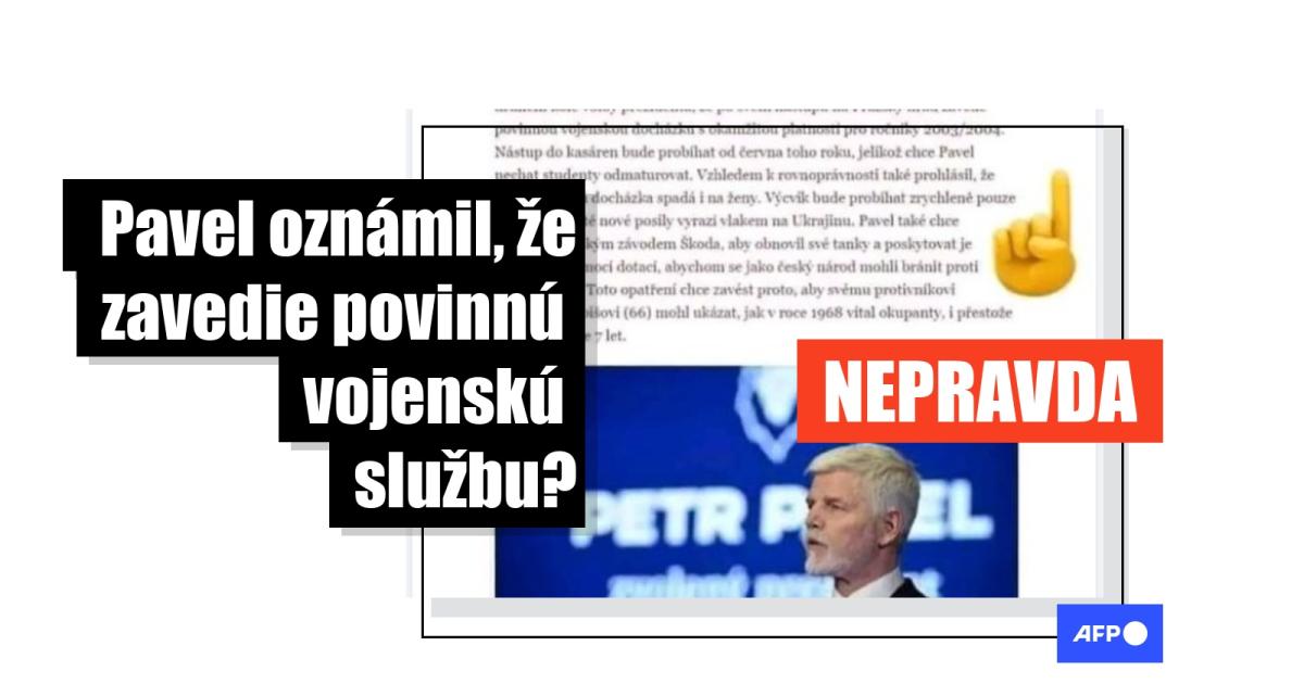 „Pavel oznámil povinnú vojnu,“ hlása nadpis zmanipulovaného článku, ktorý sa šíril na Facebooku prostredníctvom tohto príspevku z 29. januára 2023. V údajnom článku sa ďalej uvádza, že Pavel „po zvíťazení (sic) v druhom kole prezidentských volieb na tlačovej konferencii oznámil, že po svojom nástupe na Pražský hrad zavedie povinnú vojenskú dochádzku s okamžitou platnosťou pre ročníky 2003/2004“.