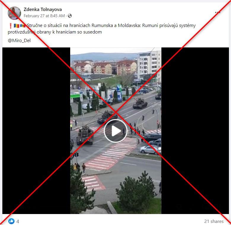 „Stručne o situácii na hraniciach Rumunska a Moldavska: Rumuni prisúvajú systémy protivzdušnej obrany k hraniciam so susedom,“ píše sa v nepravdivom príspevku používateľky Facebooku z 27. februára 2023 pri videu, na ktorom vidieť vojenské vozidlá idúce po ulici mesta. Podobné príspevky sa šírili aj na Telegrame: „Rumuni sťahujú systémy protivzdušnej obrany k hraniciam s Moldavskom,“ píše sa pri rovnakom videu na kanáli proruskej siete NewsFront, ktorú sme v AFP opakovane hodnotili (tu, tu, tu).