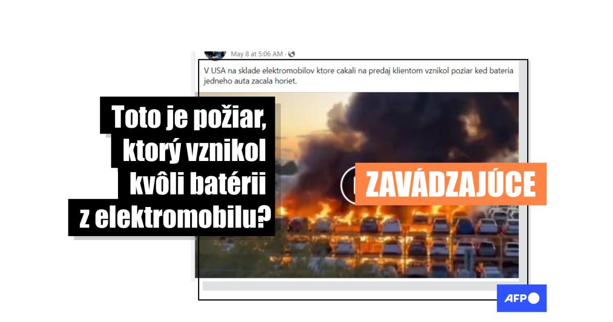 „V USA na sklade elektromobilov ktore cakali na predaj klientom vznikol poziar ked bateria jedneho auta zacala horiet,“ píše sa po slovensky v popise videa, ktoré uverejnil na Facebooku súkromný používateľský profil 8. mája 2023 a ktoré nazbieralo viac ako 7,5 milióna pozretí a takmer 150-tisíc zdieľaní.