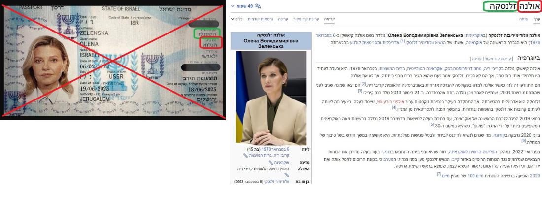 Ďalším znakom, že ide o falošný pas, je uvedené miesto narodenia Zelenskej ako ZSSR, teda bývalý Sovietsky zväz. Zelenská sa narodila 6. febráura 1978 v ukrajinskom Kryvom Rihu ešte pred tým, ako Ukrajina získala nezávislosť v roku 1991. Ako však potvrdil novinár AFP, Izraelčania narodení na Ukrajine pred rokom 1991, ktorí do Izraela emigrovali po roku 1991, majú v pase ako miesto narodenia uvedenú Ukrajinu.