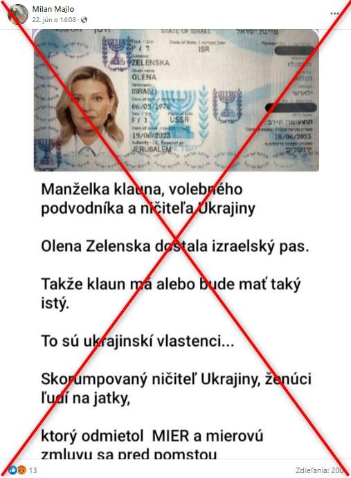 „Manželka klauna, volebného podvodníka a ničiteľa Ukrajiny Olena Zelenská dostala izraelský pas. Takže klaun má, alebo bude mať taký istý,“ píše sa v príspevku na Facebooku z 27. júna 2023, ktorý zdieľali stovky používateľov. Podobné príspevky sa v slovenčine šírili na Telegrame či VKontakte, objavovali sa aj v poľštine alebo v ruštine.