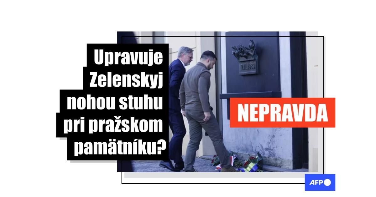 Fotografia neukazuje, že by Zelenskyj pri spomienke v Prahe naprával stuhu na kytici nohou