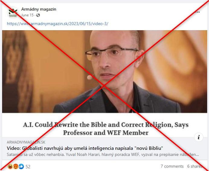 „Satanisti sa už vôbec nehanbia. Yuval Noah Harari, hlavný poradca WEF, vyzval na prepísanie náboženských spisov umelou inteligenciou, aby sa vytvorila globalizovaná a inkluzívnejšia 'nová Biblia',“ píše sa v texte zverejnenom 15. júna 2023 na slovenskom webe Armádny magazín.
