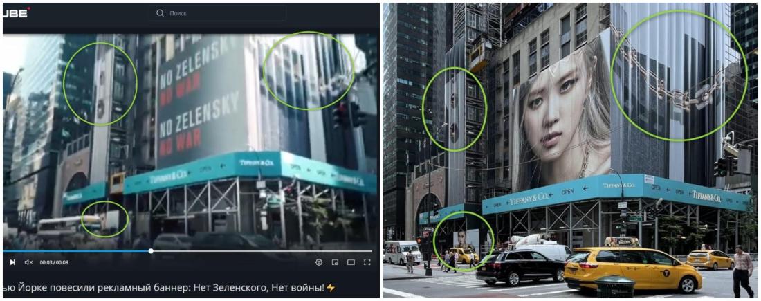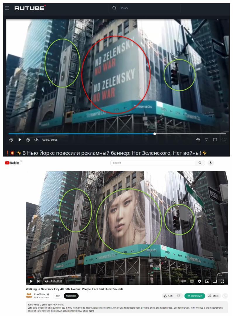 Následne sa kamera posunie smerom nahor a zachytáva budovu Tiffany & Co. zakrytú reklamnými pútačmi. Vidíme, že okrem jednej významnej výnimky - postprodukčne doplneného „pútača“ namiereného proti Zelenskému - je pri ostatných pútačoch a prvkoch medzi pôvodným a zmanipulovaným videom dokonalá zhoda: