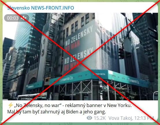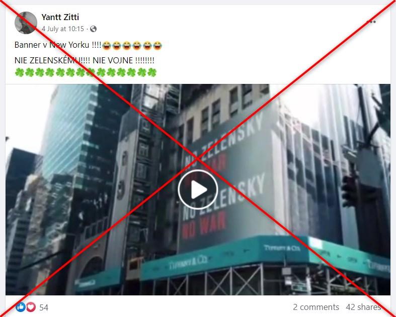 „Banner v New Yorku !!!! NIE ZELENSKÉMU!!!! NIE VOJNE !!!!!!!!“ píše sa v príspevku (tu, tu) osobného FB profilu uverejnenom 4. júla, ktorý zdieľalo viac ako 40 používateľov. Súčasťou príspevku je aj 8-sekundové video, na ktorom vidíme budovu pod lešením s reklamnými pútačmi. Na jednom z nich je v angličtine napísané „No Zelensky, no war“ (Nie Zelenskému, nie vojne, pozn. red.).