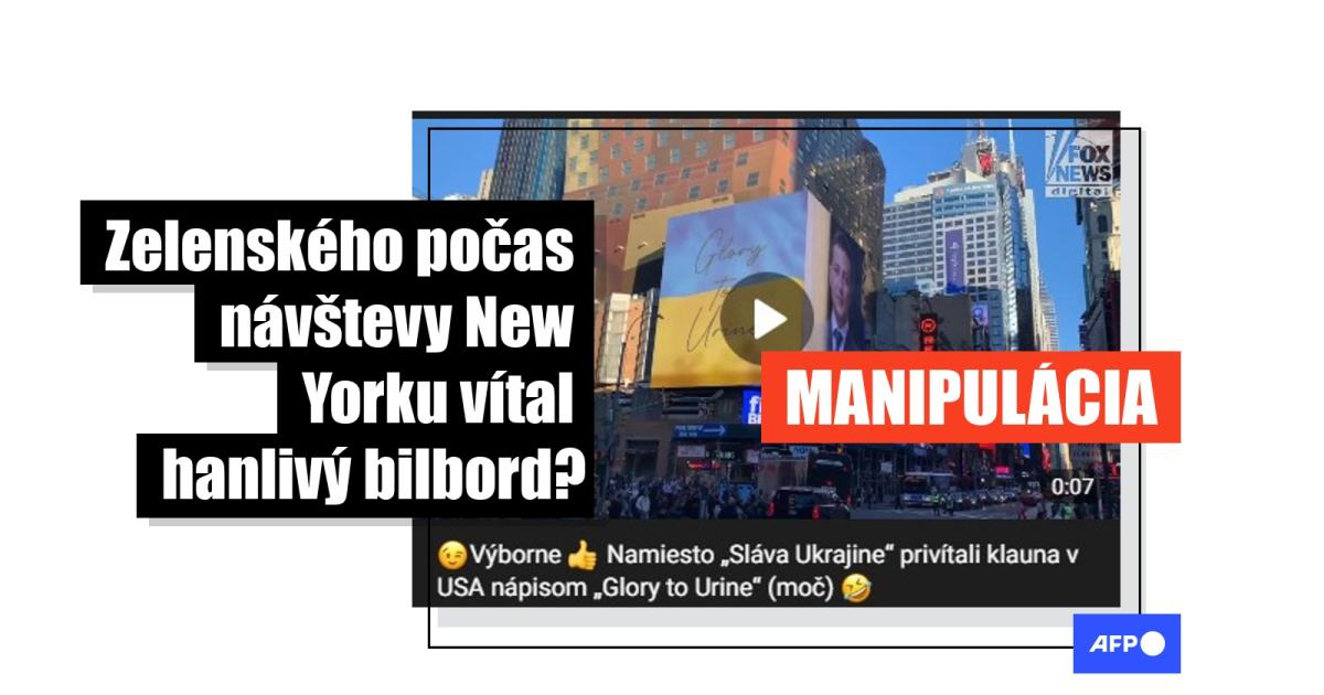 Ako sme zistili vlastnou analýzou v rámci agentúry AFP, Zelenského neprivítali v New Yorku odkazom „Sláva moču“. Taktiež spoločnosť, ktorá má na starosti bilbord na tomto mieste, neoznámila, že došlo k chybe v jej počítačovom systéme.