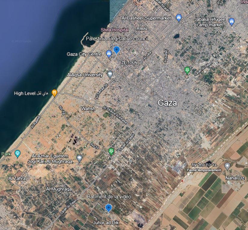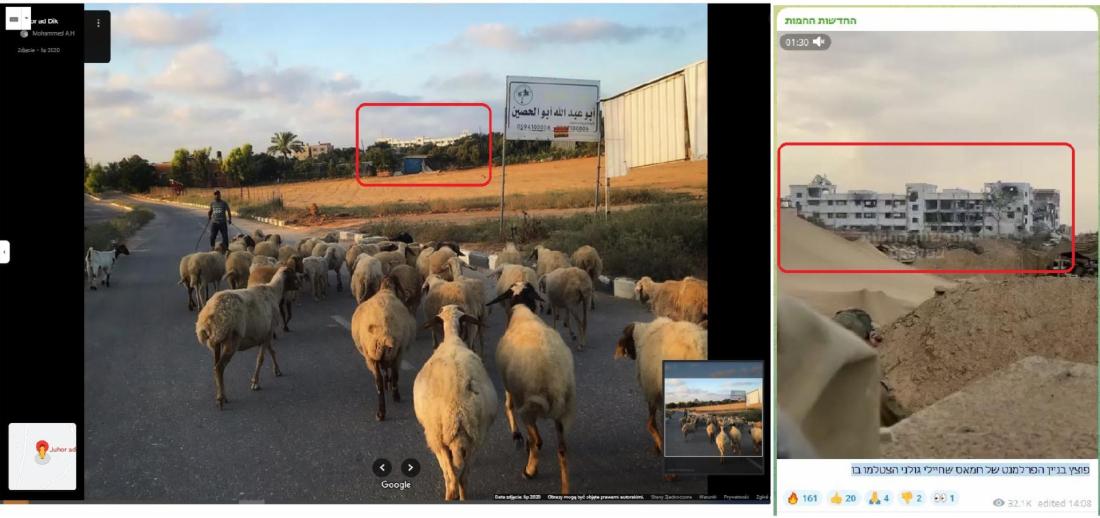 Vďaka informáciám v komentároch používateľov (archívny odkaz), ktorí budovu a miesto, kde bolo video natočené, spoznali, AFP lokalizovala jej polohu na Google Maps. Budova sa v skutočnosti nachádza v obci Juhor ad-Dik, v centrálnej časti Pásma Gazy, len niekoľko desiatok metrov od školy, ktorej športové ihrisko je dobre viditeľné na satelitnej snímke (archívny odkaz).
