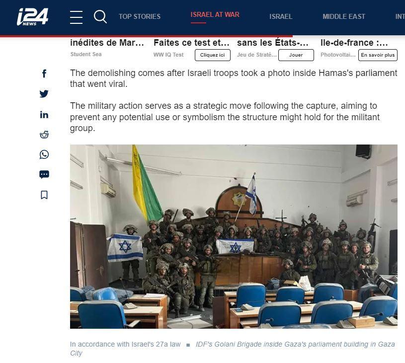 Vo viacerých spravodajských článkoch, napríklad na izraelskej webovej stránke i24 News alebo na českom webe Echo24, sa vyskytuje aj fotografia zachytávajúca izraelských vojakov pózujúcich s vlajkou Izraela a žlto-zelenou vlajkou Prvej brigády Golani v rokovacej sále parlamentu v Gaze po tom, ako získali kontrolu nad daným priestorom.