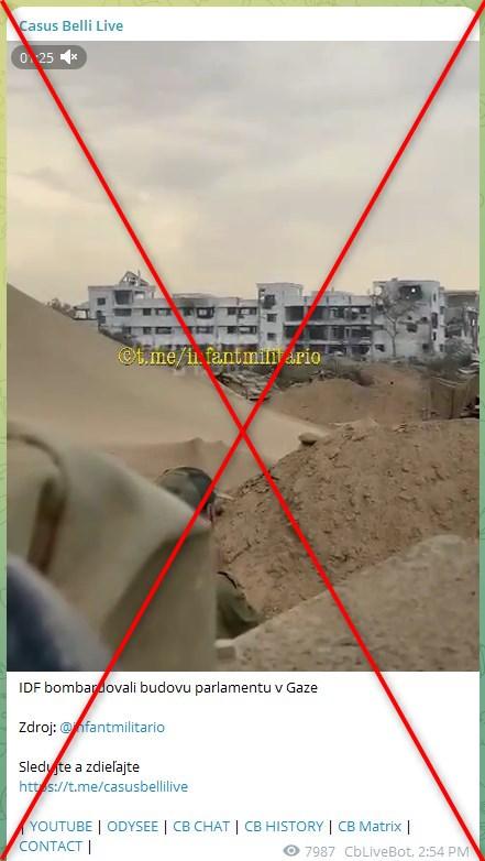 Dňa 15. novembra sa na internete objavilo video, na ktorom vidieť mohutný výbuch budovy, ktorú následne zahalí tmavý dym. Používatelia sociálnych sietí zdieľali na Facebooku či Telegrame predmetné video spoločne s popisom „IDF bombardovali budovu parlamentu v Gaze“ (IDF je skratka pre Izraelské ozbrojené sily, pozn. red.).