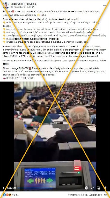 „ŠIALENÉ!! ODHLASOVANÉ! EÚ sa má zmeniť na VOJENSKÚ FEDERÁCIU bez práva veta pre jednotlivé štáty. A masmédiá sú ticho,“ píše sa pri tomto FB videu europoslanca a predsedu krajne pravicového hnutia Republika Milana Uhríka z 22. novembra 2023, ktoré videlo viac ako 145-tisíc používateľov a viac ako 6,1-tisíc ho zdieľalo ďalej.