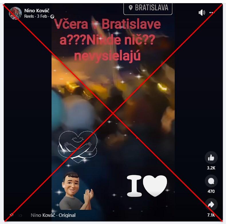 38-sekundové video uverejnené na Facebooku 3. februára 2024 zachytáva dav ľudí, ako skandujú „Nech žije Putin!“ a „Nikdy proti Rusom!“. Vo videu sa nachádza popis: „Včera v Brarislava a???Nikde nič?? nevysielajú. Krátke video v FB formáte „reels“ zdieľalo viac ako 7-tisíc používateľov.