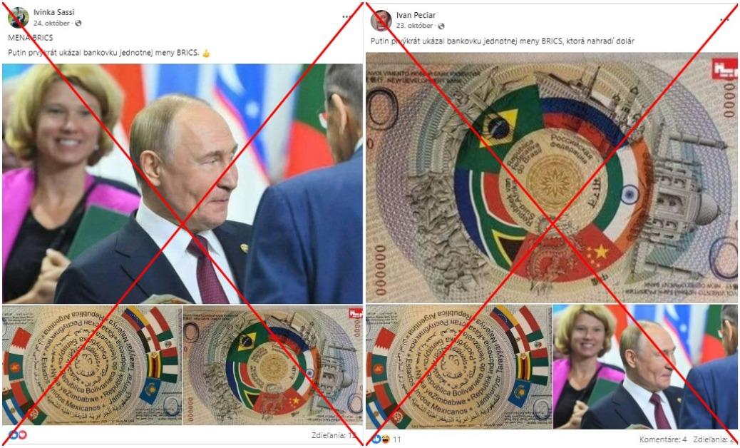 „Putin prvýkrát ukázal bankovku jednotnej meny BRICS, ktorá nahradí dolár", tvrdí tento post na Facebooku. Podobné tvrdenia na slovenskom Facebooku zdieľali desiatky občanov a šírili sa aj na sieti Telegram.