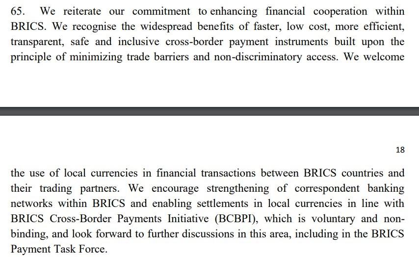 „Podporujeme posilnenie korešpondenčných bankových sietí v rámci BRICS a uľahčenie zúčtovania v miestnych menách v súlade s Iniciatívou BRICS pre cezhraničné platby (BCBPI), ktorá je dobrovoľná a nezáväzná, a očakávame ďalšie diskusie v tejto oblasti, a to aj v rámci pracovnej skupiny BRICS pre platby,“ uvádza sa v časti vyhlásenia.