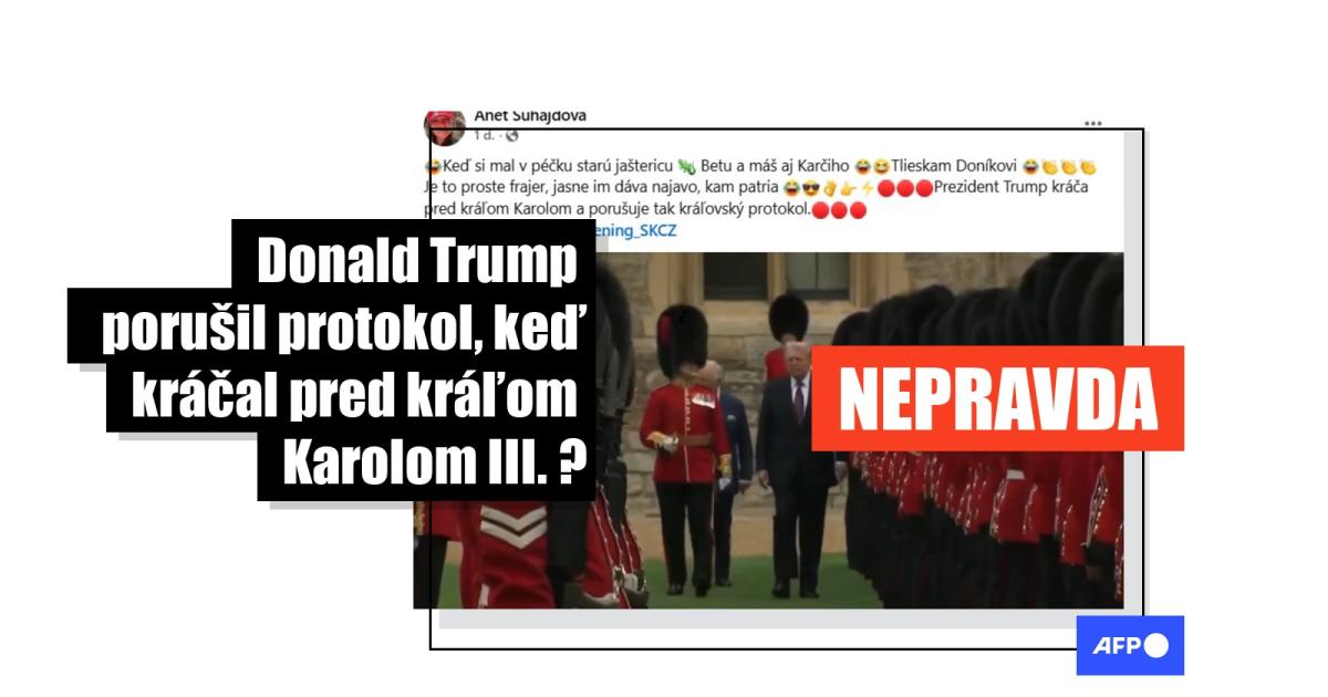 „Je to proste frajer, jasne im dáva najavo, kam patria. Prezident Trump kráča pred kráľom Karolom a porušuje tak kráľovský protokol,“ čítame v príspevku na Facebooku, ktorý bol od 17. septembra 2025 zdieľaný 20-krát.