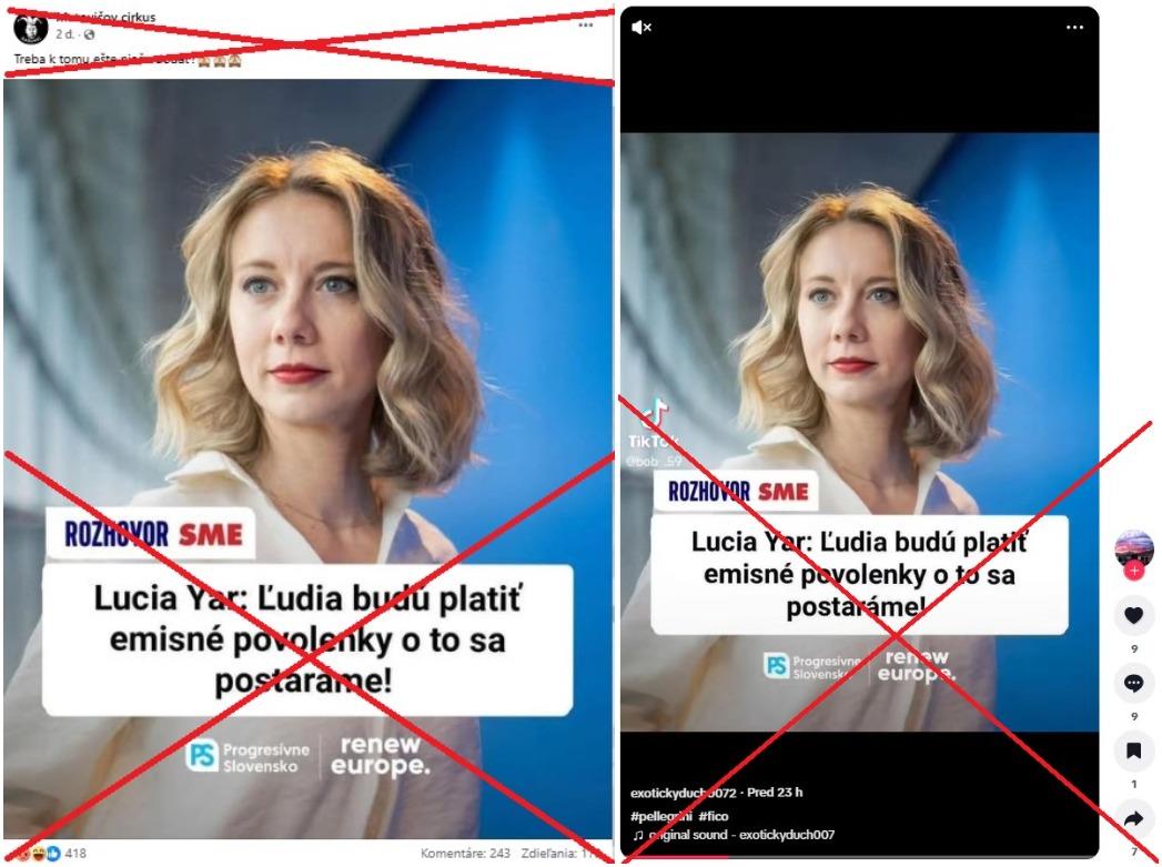 V tejto súvislosti bol v príspevku na Facebooku zdieľaný obrázok poslankyne Európskeho parlamentu za stranu Progresívne Slovensko s nadpisom: „Lucia Yar: Ľudia budú platiť emisné povolenky o to sa postaráme!“. Tento príspevok bol od 19. októbra 2025 zdieľaný vyše 170-krát. Rovnaký obrázok s údajným citátom sme našli aj v príspevku na TikToku z 20. októbra 2025.