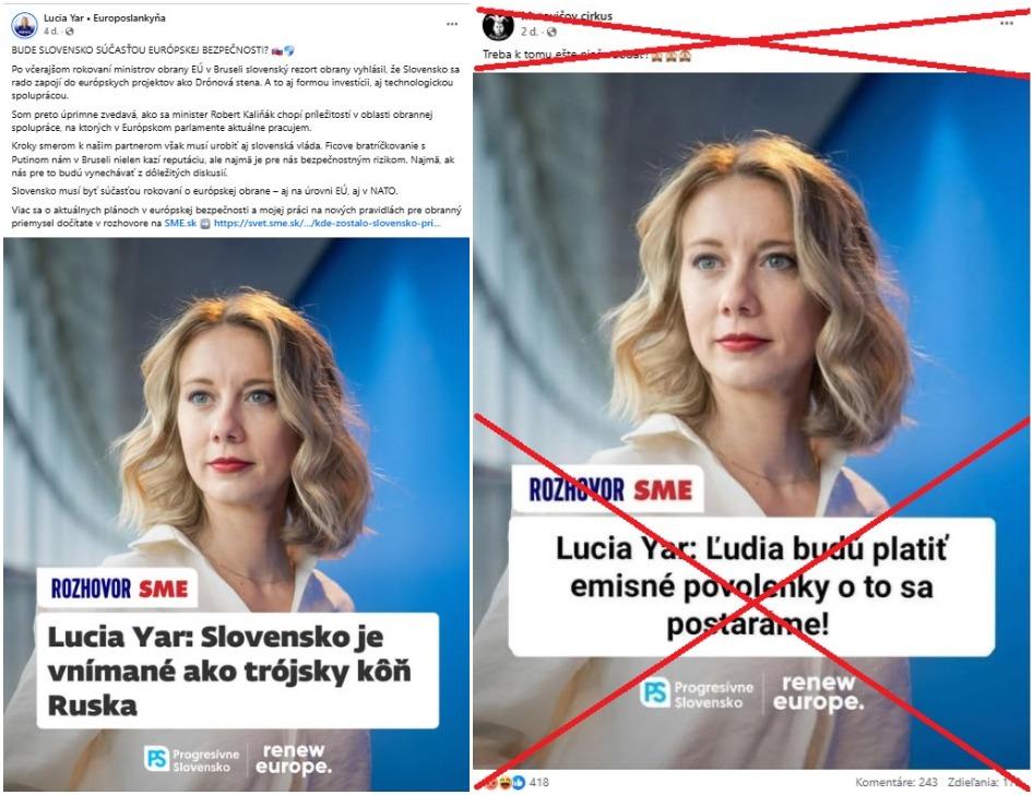 Nápis o emisných povolenkách pôsobí na prvý pohľad neautenticky, keďže obsahuje štylistickú chybu v podobe chýbajúcej čiarky. Reverzným vyhľadávaním obrázkov sme prišli na to, že predmetný príspevok je v skutočnosti upravená verzia pôvodného príspevku Lucie Yar, ktorým propagovala svoj rozhovor pre denník SME z 29. septembra 2025 na Facebooku aj Instagrame. V pôvodných príspevkoch političky figuruje nadpis: „Lucia Yar: Slovensko je vnímané ako trójsky kôň Ruska“.