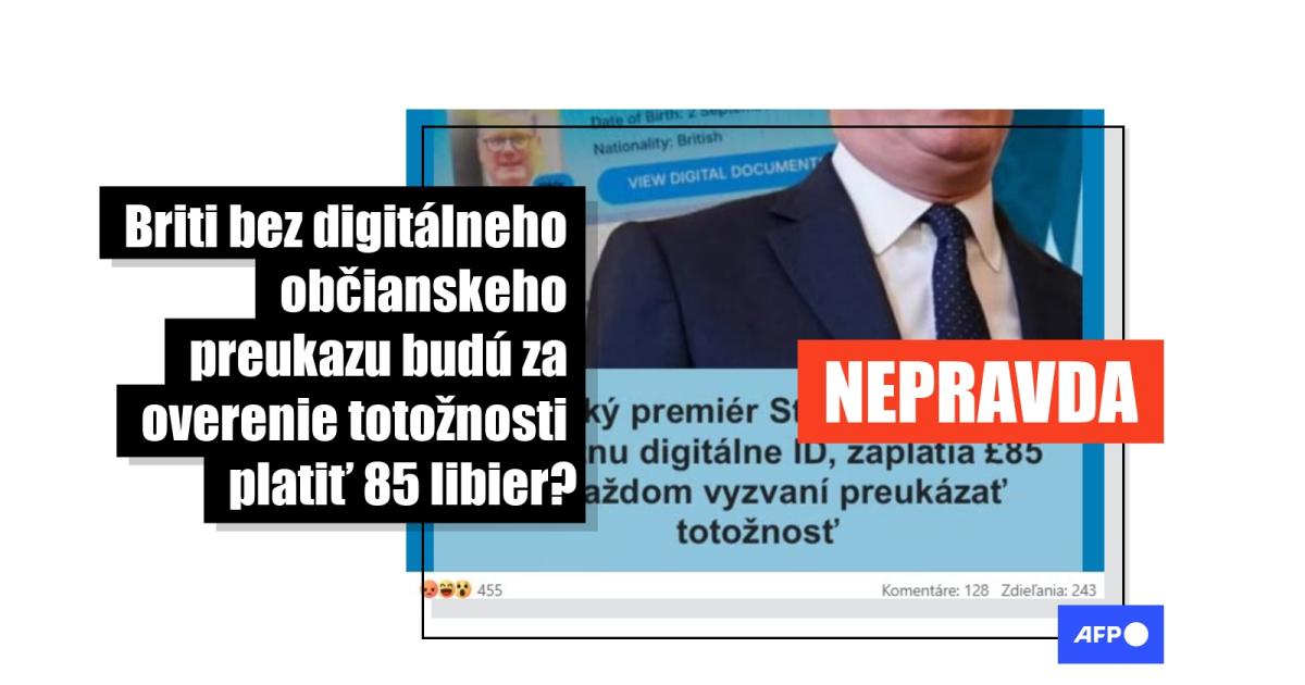Septembrový oznam britského premiéra Keira Starmera o plánoch na zavedenie celoštátneho digitálneho preukazu totožnosti spôsobil, že sa v Spojenom kráľovstve aj v celej Európe začali šíriť zavádzajúce tvrdenia. Na Slovensku sa vo veľkom šírili príspevky tvrdiace, že Starmer novinárom povedal, že občania bez digitálneho preukazu totožnosti budú musieť zaplatiť 85 libier vždy, keď budú potrebovať preukázať svoju totožnosť. V skutočnosti narážal na prípad dvoch ľudí, ktorí museli zaplatiť túto sumu súkromnej spoločnosti za overenie svojej totožnosti pri kúpe domu. Išlo teda o výdavok, ktorému by sa podľa neho dalo vyhnúť použitím digitálneho preukazu totožnosti. AFP sa podarilo objaviť celé video, v ktorom Starmer spomína tento prípad a je z neho zrejmé, že jeho slová boli vytrhnuté z kontextu.
