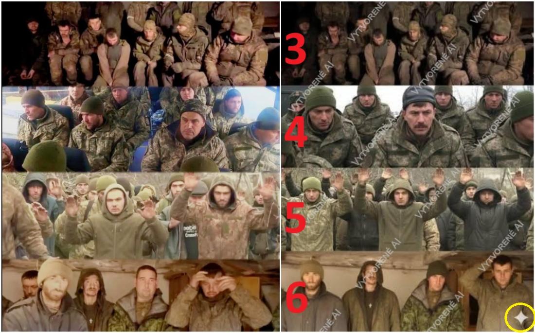 Posledný obrázok označený číslom 6 vznikol s najväčšou pravdepodobnosťou na základe snímky obrazovky z videa publikovaného 21. apríla 2025, ktoré vypovedá o zajatí deviatich ruských vojakov ukrajinskými výsadkármi. O udalosti, ktorá sa odohrala v Kurskej oblasti, informovali aj ukrajinské médiá tu alebo tu. Pôvodné video publikovalo na Facebooku Veliteľstvo výsadkových a útočných síl Ozbrojených síl Ukrajiny.