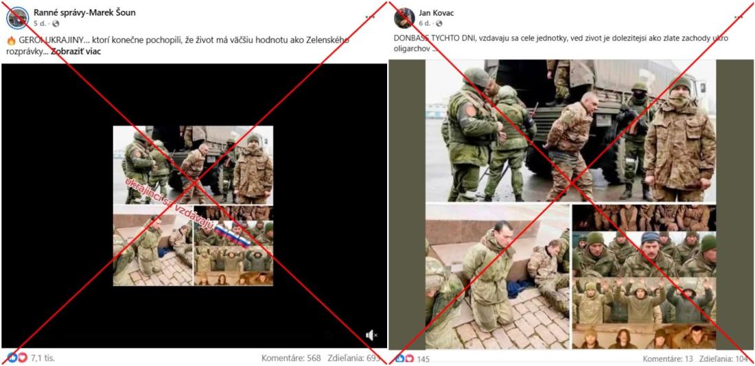 Neexistujú však žiadne dôveryhodné správy o nedávnych hromadných kapituláciách ukrajinských vojakov. Vyšetrovanie agentúry AFP ukázalo, že žiadna zo šiestich fotografií v koláži nesúvisí so súčasnými udalosťami v priemyselnej oblasti Donbas.