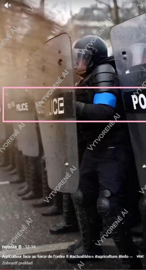 „Policajti dostali najnovší parfém z dielne Von Der Pfizer,“ píše sa v slovenskom facebookovom príspevku, ktorý bol od 19. decembra 2025 zdieľaný asi 500-krát. Obsahuje 10-sekundové video, na ktorom muž šoférujúci traktor strieka hnedú tekutinu pripomínajúcu hnoj na policajtov v uniformách, prilbách a s priesvitnými štítmi. Jeden z nich nahlas hovorí vo francúzštine: „Prečo tu smrdí hovno?!“ Na jednom zo záberov vidíme v pozadí stavbu pripomínajúci víťazný oblúk v Paríži.
