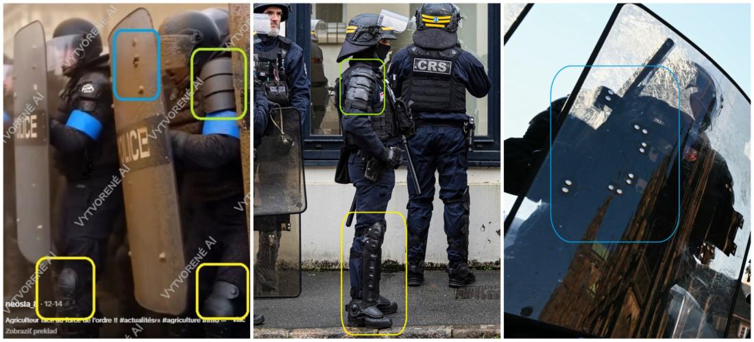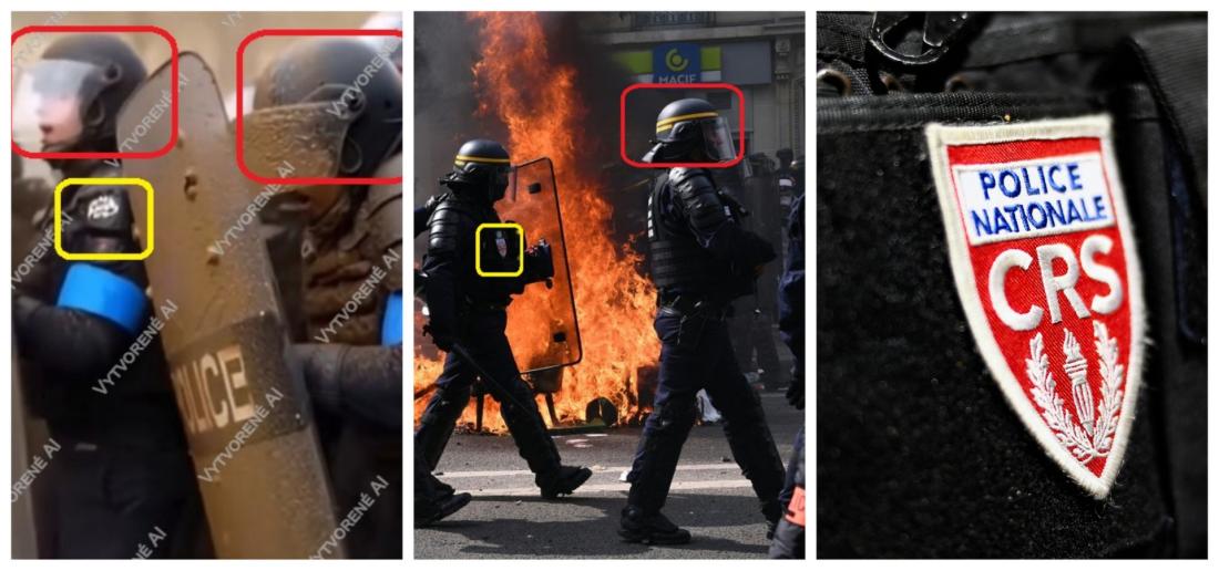Pri porovnaní záberov z virálneho videa s autentickými fotografiami agentúry AFP z nedávnych francúzskych protestov sme si všimli niekoľko nezrovnalostí. Uniformy jednotky CRS na agentúrnych fotografiách obsahujú oveľa viac identifikovateľných detailov, a to napríklad na ramenných chráničoch, ochranných návlekoch na nohách alebo prilbách. Detaily skutočnej uniformy CRS môžeme vidieť aj na oficiálnej webovej stránke francúzskej národnej polície.