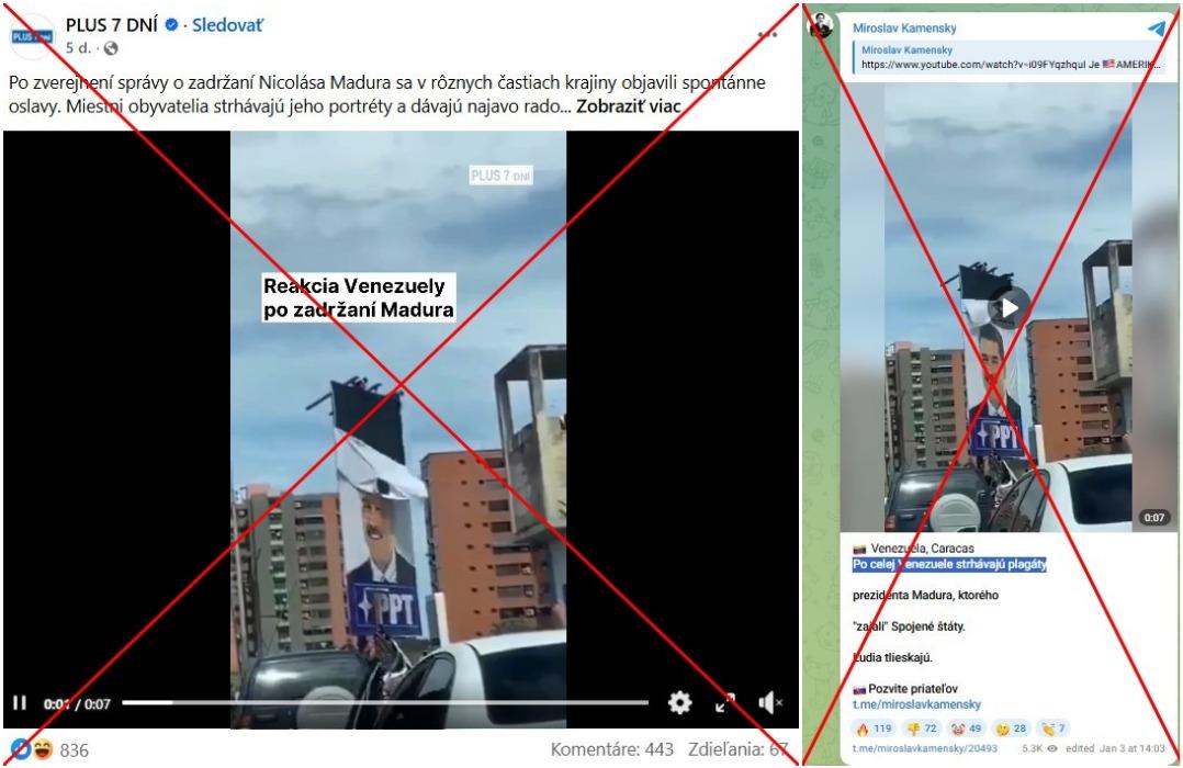 „Po zverejnení správy o zadržaní Nicolása Madura sa v rôznych častiach krajiny objavili spontánne oslavy. Miestni obyvatelia strhávajú jeho portréty a dávajú najavo radosť z vývoja situácie,“ píše sa vo facebookovom príspevku slovenského týždenníka Plus 7 dní. Príspevok obsahujúci 7-sekundové video od 3. januára 2026 nazbieral 82-tisíc videní a 67 zdieľaní.