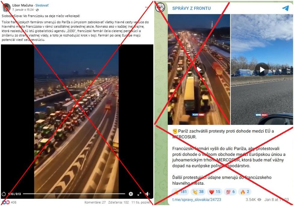 „Vo Francúzsku sa deje niečo veľkolepé! Tisíce francúzskych farmárov smerujú do Paríža s úmyslom zablokovať všetky hlavné cesty vedúce do hlavného mesta Francúzska v rámci celoštátnej protestnej akcie,“ čítame v slovenskom príspevku na Facebooku, ktorý bol od 7. januára 2026 zdieľaný vyše stokrát. Okrem textu obsahuje aj video dopravnej zápchy na nočnej ceste, ktorá je zdanlivo spôsobená traktormi a nákladnými autami. V pozadí rozoznávame obrysy Eiffelovej veže a zvuková stopa je tvorená hlukom vrtuľníka, cez ktorý počuť ženský hlas komentujúci výjav po francúzsky.