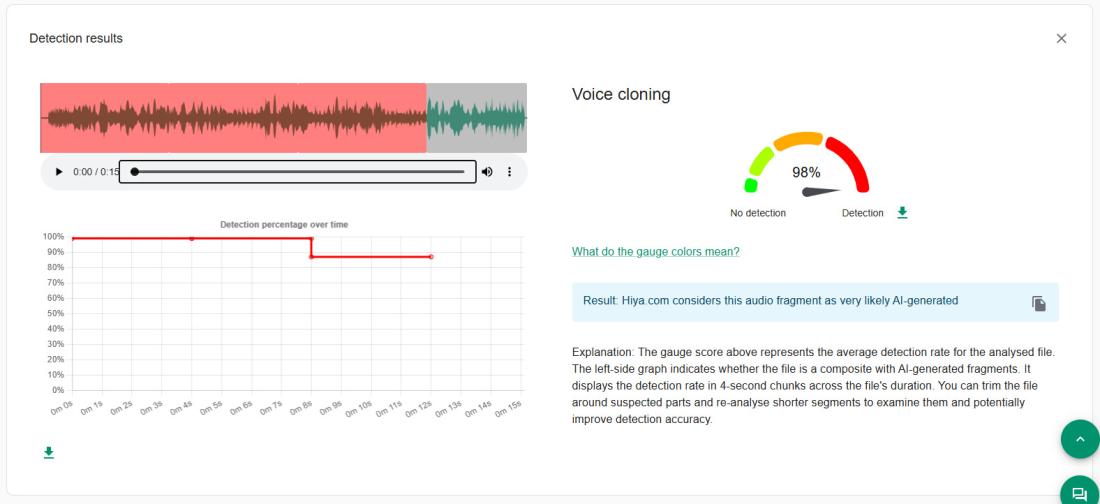 Program Hiya od InVID WeVerify, ktorý je vyvíjaný v spolupráci s AFP, odhadol, že zvuk videa bol s 98-percentnou pravdepodobnosťou vytvorený umelou inteligenciou.