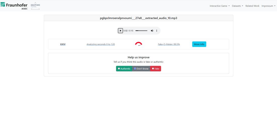 Audio stopu videa sme overili aj cez nástroj Deepfake Total určený na detekciu audio deepfake. Ten preukázal skóre 99,5 %, čo znamená vysokú pravdepodobnosť, že audio bolo vytvorené pomocou umelej inteligencie.