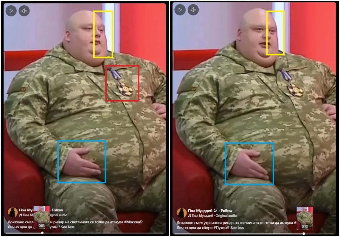 Keď agentúra AFP porovnala oba klipy, zistila vicero nezrovnalostí. V druhom videu nemá muž na hrudi medailu, jeho uniforma vyzerá inak a na rukáve má nášivku s ukrajinskou vlajkou, ktorá chýba vo videu, ktoré je predmetom nášho článku. Ďalšie nezrovnalosti si všímame aj v dizajne údajného televízneho štúdia.