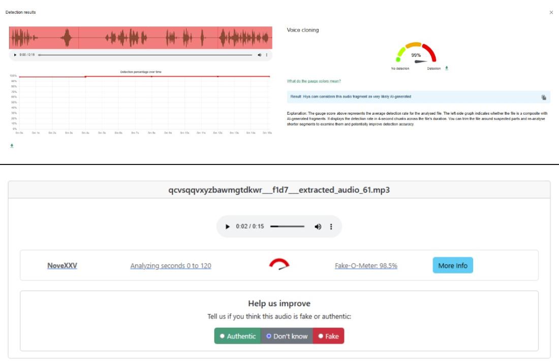 Nástroj Hiya, ktorý je integrovaný vo factcheckingovom rozšírení InVID WeVerify a vyvíjaný v spolupráci s AFP, uviedol 99-percentnú pravdepodobnosť, že zvuková stopa bola vytvorená pomocou AI.