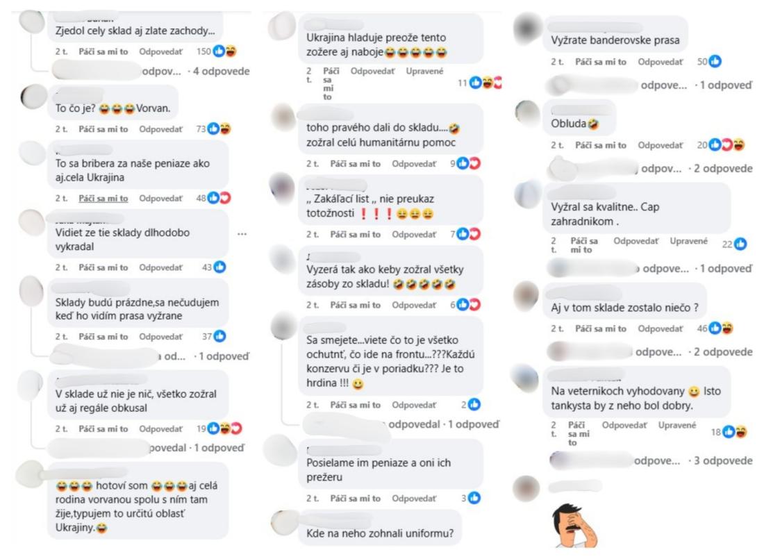 Komentáre pod slovenskými príspevkami takmer bez výnimky naznačujú, že ich autori považujú video za autentické. Tematicky im jednoznačne dominuje zosmiešňovanie vzhľadu údajného vojaka. Nechýbajú ani urážlivé poznámky namierené voči Ukrajine a jej obyvateľom.
