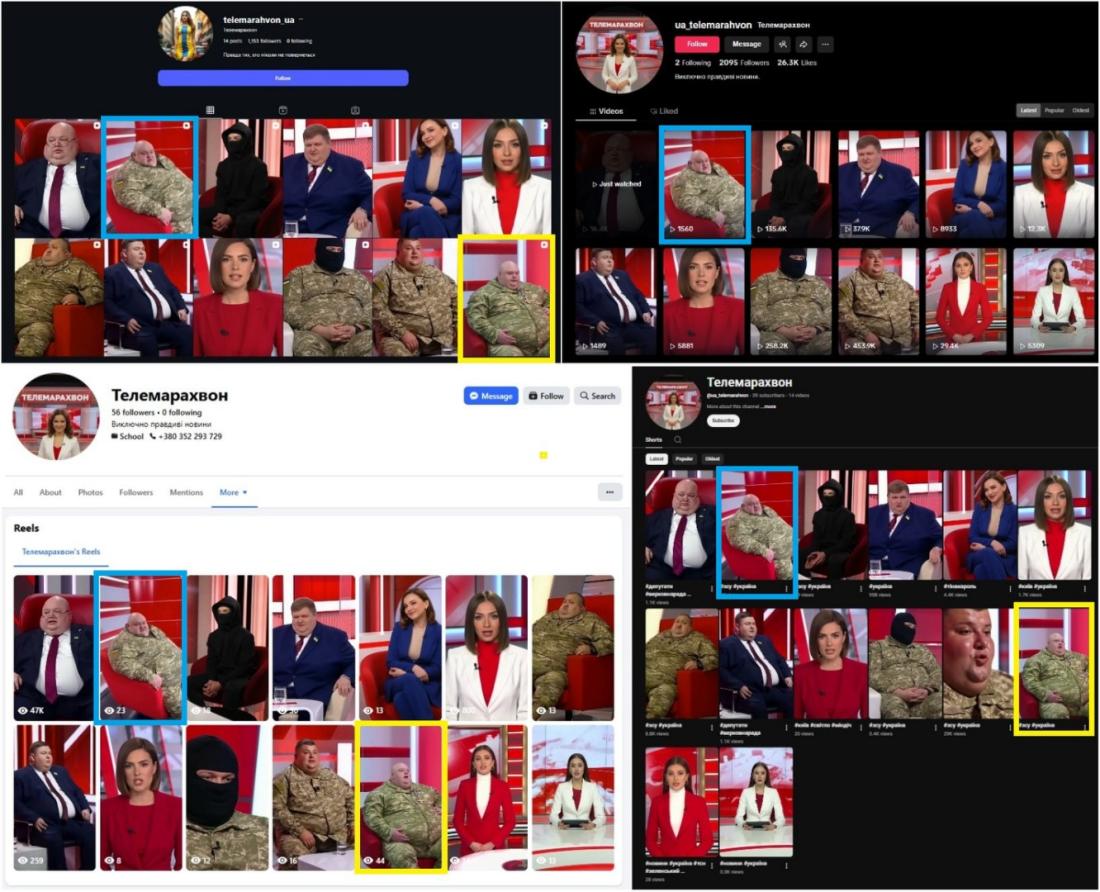 Napríklad toto video, ktoré bolo uverejnené na všetkých štyroch platformách a v koláži vyššie je zvýraznené modrou farbou, ukazuje muža, ktorý sa veľmi podobá tomu z videa virálneho na Slovensku. Takisto má oblečenú uniformu a sedí v červenom kresle v zdanlivo rovnakom štúdiu. Toto video však muža zobrazuje z iného uhla.
