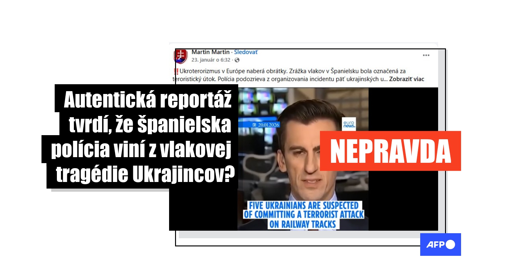 „Ukroterorizmus v Európe naberá obrátky. Zrážka vlakov v Španielsku bola označená za teroristický útok. Polícia podozrieva z organizovania incidentu päť ukrajinských utečencov, po ktorých v súčasnosti pátrajú...!“ začína sa facebookový príspevok, ktorý od 23. januára 2026 nazbieral vyše 230 zdieľaní.