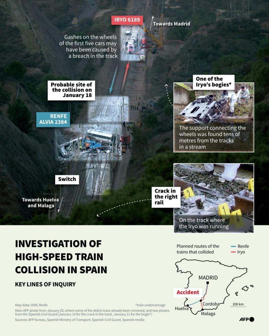Orgánom zodpovedným za vyšetrovanie miesta nehody bola Guardia Civil, ktorá patrí pod španielske ministerstvo vnútra a obrany. Jej zástupca 10. februára 2026 pre agentúru AFP uviedol, že „v žiadnom momente nemáme akýmkoľvek záznamom o tom, že by bola zvažovaná hypotéza teroristického útoku“.