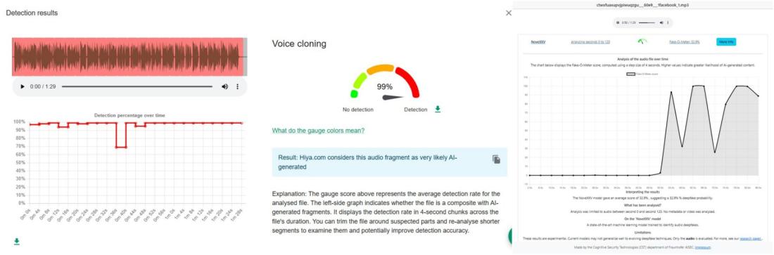 Nástroj Hiya, ktorý je integrovaný vo factcheckingovom rozšírení InVID WeVerify a vyvíjaný v spolupráci s AFP, uviedol 99-percentnú pravdepodobnosť, že zvuková stopa bola vytvorená pomocou AI.